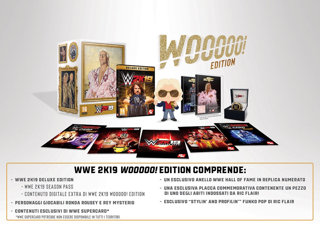 New York, NY – 25 Luglio 2018 – 2K annuncia oggi la Wooooo! Edition di WWE® 2K19, il nuovo capitolo del franchise di videogame WWE 2K. In onore del 16 volte WWE World Champion, icona pop e WWE Hall of Famer Ric Flair – un uomo la cui attitudine rappresenta al meglio il motto “Never Say Never”– la WWE 2K19 Wooooo! Edition sarà prodotta in tutto il mondo in edizione limitata di 30.000 copie. La WWE 2K19 Wooooo! Edition sarà disponibile esclusivamente per PlayStation®4 e Xbox One.