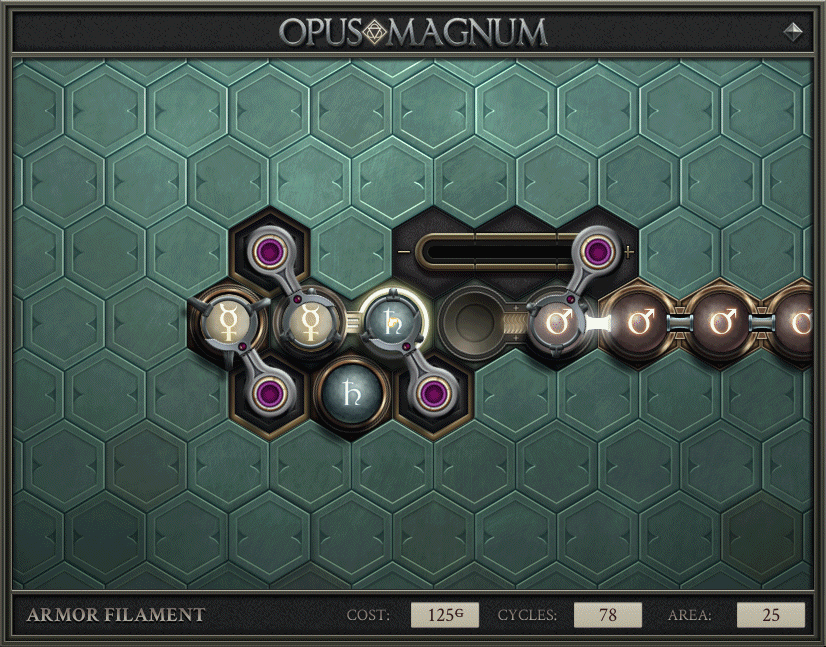 un’avventura che gli utenti fossero in grado di completare. Accessibilità e spettacolarità sono le caratteristiche che permettono a Opus Magnum di essere apprezzabile da un pubblico più vasto. I livelli sono più facili da completare e vederli funzionare è una delle cose più appaganti che esistano su questo pianeta. La narrativa e l’estetica del gioco permeano l’esperienza, contribuendo non poco al coinvolgimento del giocatore, ma mantenendo il fulcro nel gameplay e nei puzzle.
