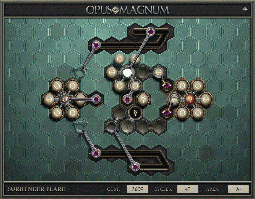 un’avventura che gli utenti fossero in grado di completare. Accessibilità e spettacolarità sono le caratteristiche che permettono a Opus Magnum di essere apprezzabile da un pubblico più vasto. I livelli sono più facili da completare e vederli funzionare è una delle cose più appaganti che esistano su questo pianeta. La narrativa e l’estetica del gioco permeano l’esperienza, contribuendo non poco al coinvolgimento del giocatore, ma mantenendo il fulcro nel gameplay e nei puzzle.
