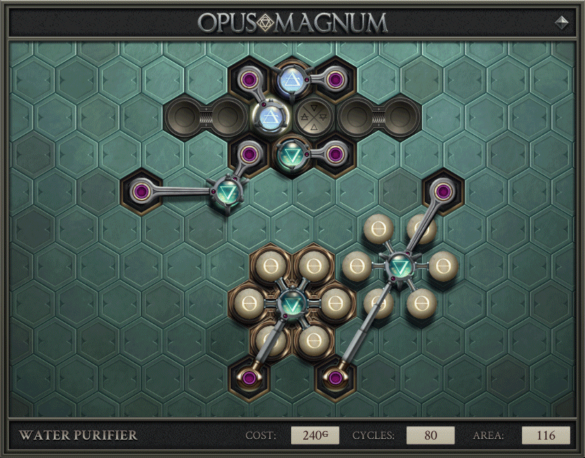 Opus Magnum è il più accessibile dei giochi Zachtronics. Se lo spazio di lavoro in SHENZHEN I/O era limitato, in Opus Magnum si possono costruire macchine di qualunque grandezza si voglia. Per la precisione,