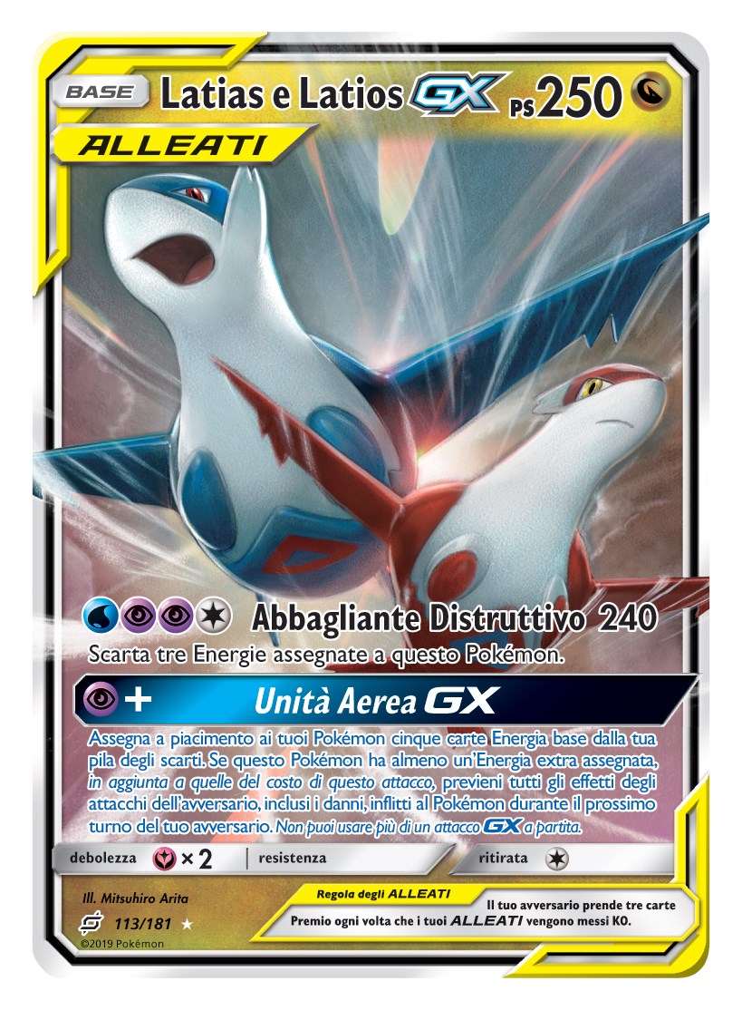 Annunciati nel corso degli scorsi Campionati Mondiali Pokémon 2018, i Pokémon-GX ALLEATI introducono una meccanica di gioco inedita e dalla potenza inaudita che offrirà ai giocatori lotte sul filo del rasoio, dove tanto la posta in gioco è alta quanto proficuo il rendimento. Alcune di queste carte dalla potenza senza precedenti e dai PS altissimi, infatti, dispongono di attacchi GX in grado di mandare KO in un solo colpo anche i Pokémon-GX nella panchina dell’avversario, ma comportano un rischio: quest’ultimo si aggiudicherà ben tre carte Premio se riuscirà a mandare a tappeto un Pokémon-GX ALLEATI.
