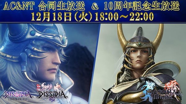 Square Enix terrà una diretta streaming riguardo Dissidia Final Fantasy NT per PS4 ed i titoli Dissidia Final Fantasy per cabinati, in commemorazione del decimo anniversario del debutto della serie su PSP. La data è il 18 dicembre dalle 18:00 alle 22:00 JST (dalle 11:00 alle 15:00 orario italiano), e sarà possibile seguirla su YouTube.