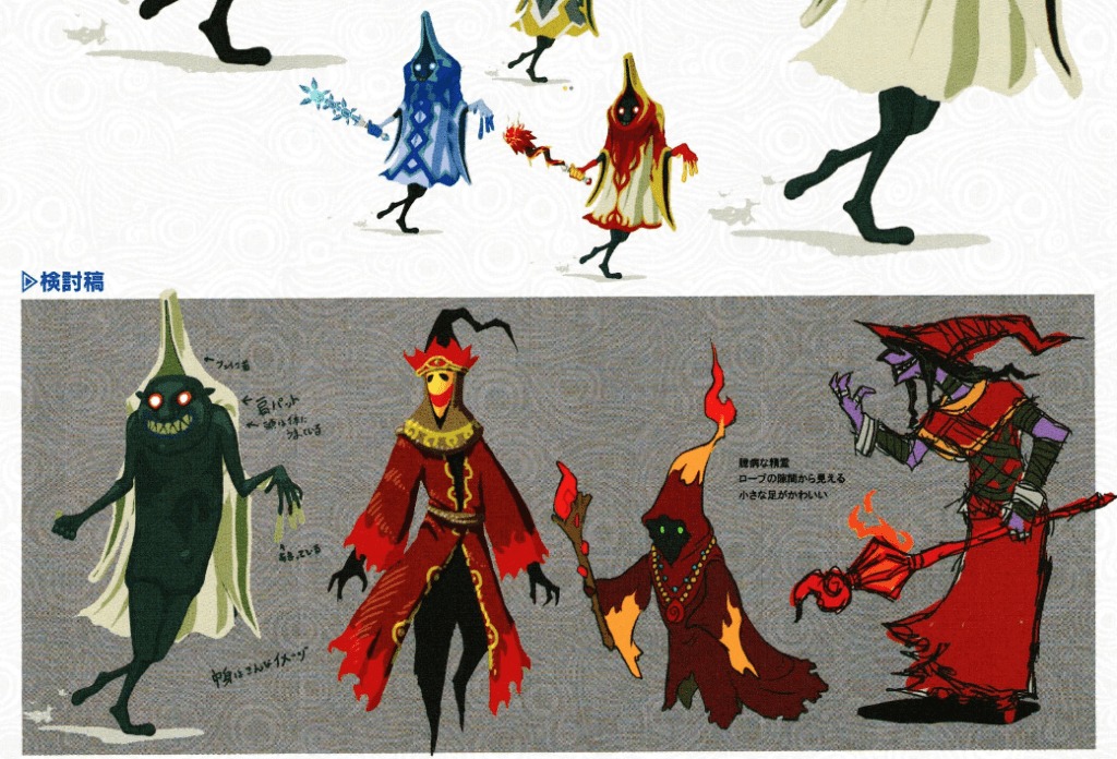 Questi sono i quattro modelli inizialmente pensati per i Wizzrobe. Il primo da sinistra, in realta, è come appare il nemico sotto la veste ed è non poco inquietante. Gli altri, invece, sono meno “fumettosi” rispetto a quelli utilizzati nella versione finale.