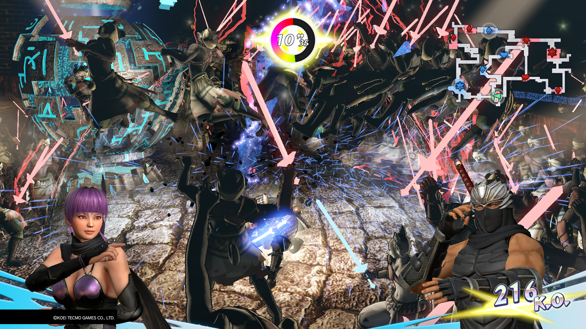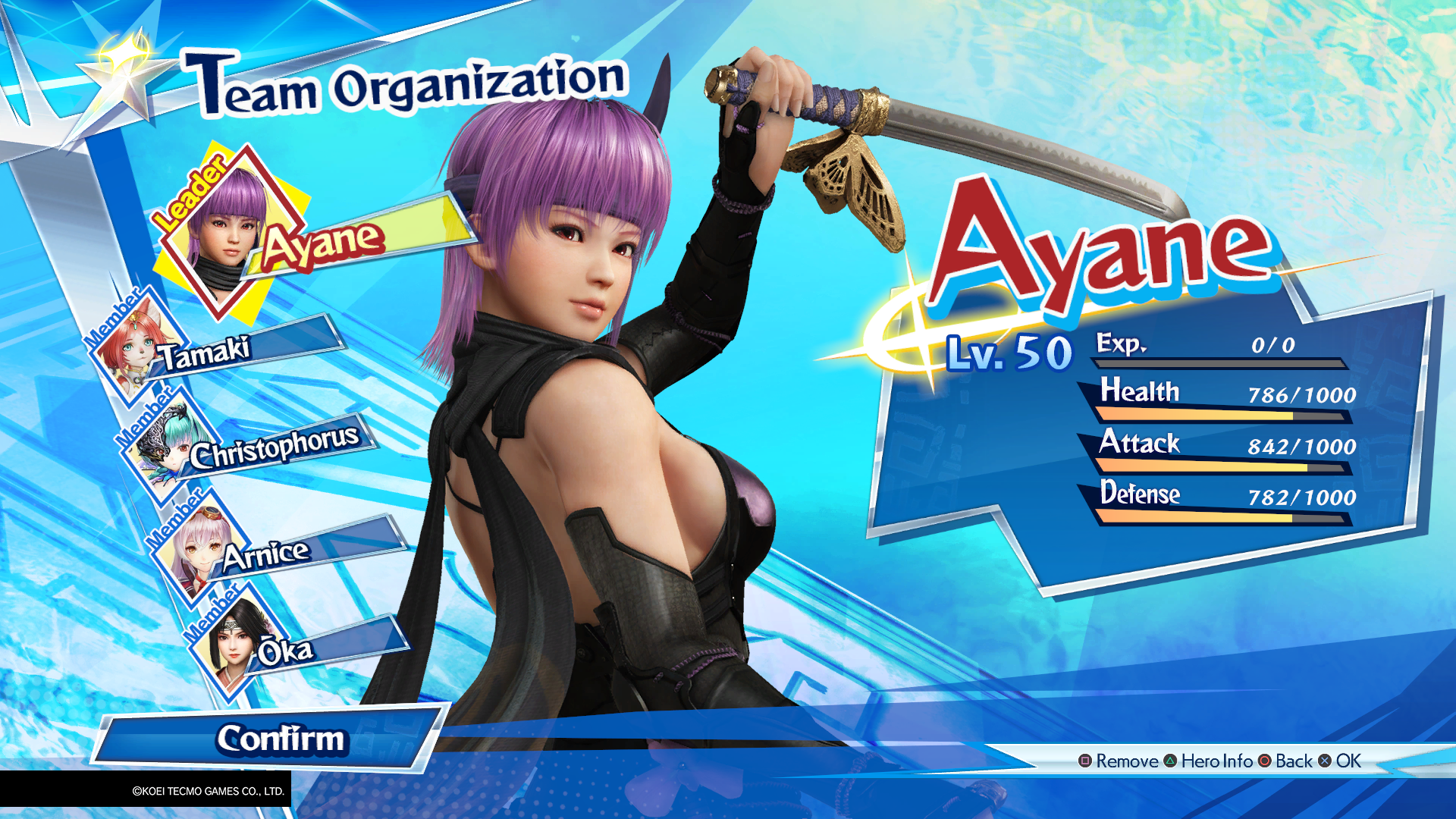 Abbiamo già parlato di come il gioco peschi qualche eroe da tutte le produzioni Koei Tecmo, famose o meno che siano, oltre quelle già citate infatti non mancano personaggi dalla trinità Warriors (Dynasty Warriors, Samurai Warriors e Warriors Orochi) da Toukiden, da Dead or Alive e perfino dai Pachinko dedicati al gioco d’azzardo (la bella Rio) e dal misconosciuto Opoona per Wii. Mancano purtroppo le eroine delle ultime produzioni (Blue Reflection, Night of Azure 2) ma sono assenze che probabilmente verranno riempite in un futuro sequel. Warriors All-Stars vi permette di controllare un team di cinque eroi (scelti tra quelli sbloccati nel corso dell’avventura) con cui partecipare alla battaglie della storia o alle missioni secondarie. Ogni eroe ha il proprio move-set che prende ovviamente spunto dal suo gioco di provenienza, ma principalmente le tipologie si distinguono in fisici,da lontano e a 360°. Come da tradizione del genere, sconfiggendo le orde di nemici si guadagnerà esperienza, e più sarà valida la performance sul campo di battaglia, più sarà alta la valutazione e la ricompensa. Al termine di ogni battaglia gli eroi del party aumenteranno la loro sintonia, sbloccando nuove abilità passive da equipaggiare poi nell’hub. Se decideremo di cambiare un membro della squadra con cui abbiamo già raggiunto il livello di affezione massimo, quest’ultimo non sparirà nei meandri dei personaggi sbloccati, ma ci seguirà comunque in battaglia come PNG. Questa è una delle prime nuove introduzioni di Warriors All-Stars che abbiamo apprezzato di più durante la nostra avventura: verso i capitoli finali infatti, non ci trovavamo più a dover salvare Soldato Generico A dall’attacco nemico, ma dovevamo andare in soccorso di William o di Ryu aumentandone nettamente l’immersività. Speriamo vivamente Omega Force tenga conto di questo aspetto anche per i futuri giochi del genere.